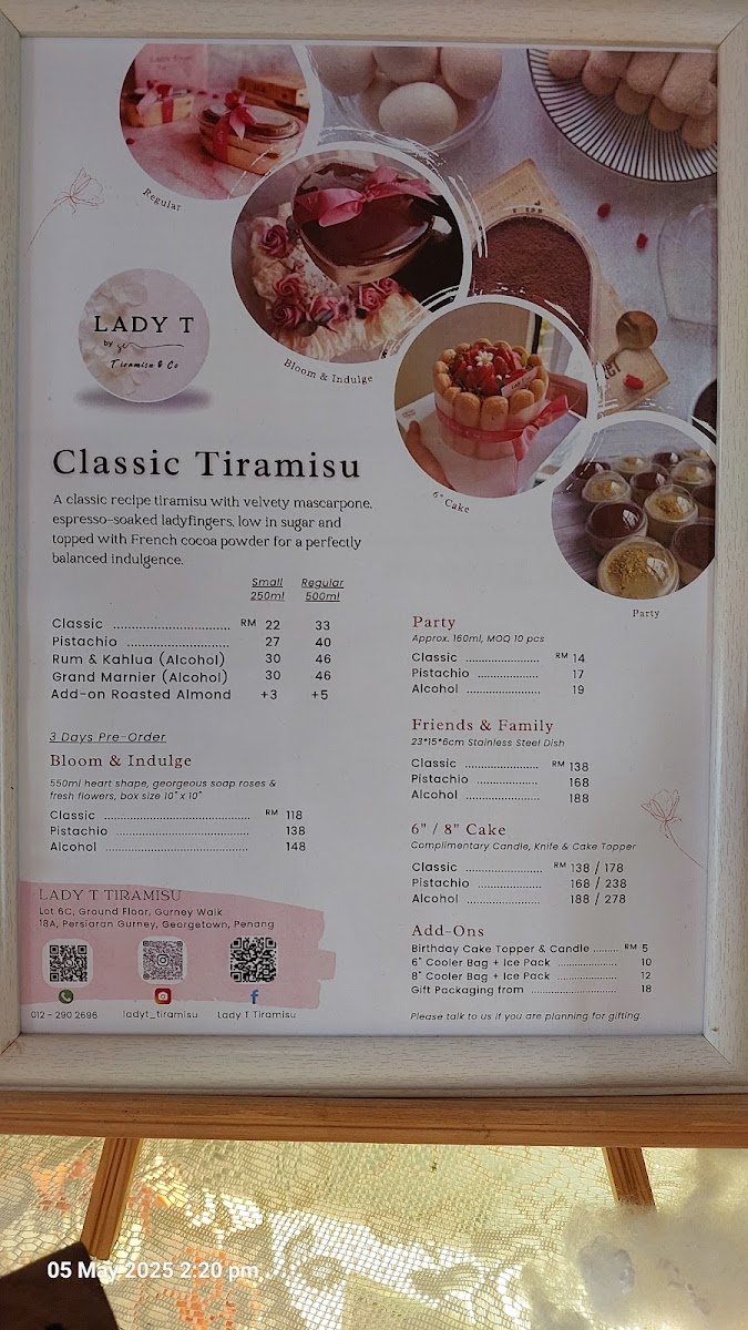 Welcome to the sweet sanctuary of Lady T Tiramisu, where dessert dreams come true in George Town, Malaysia. Specializing in exquisite tiramisu creations, this dessert restaurant elegantly marries traditional recipes with innovative flair. Picture yourself indulging in their celebrated pistachio tiramisu, crafted with premium nuts for a nutty sophistication that elevates every bite. Customers rave about the impeccable presentation, with thoughtful packaging that resembles a treasure trove of culinary art.